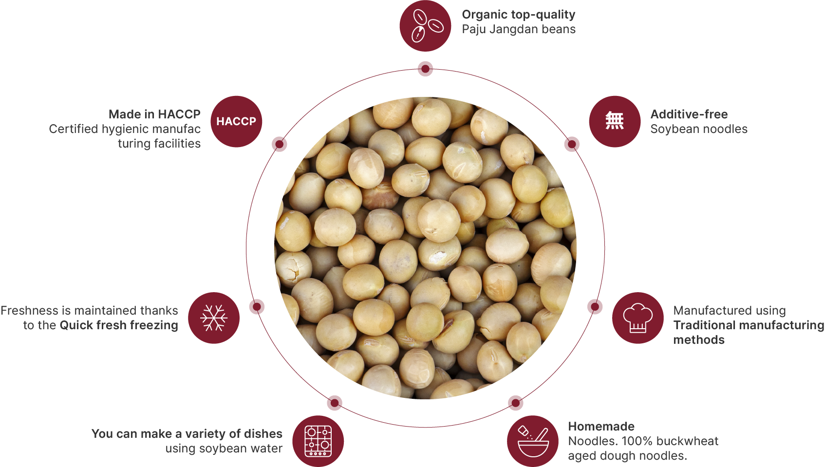 We make delicious, organic, top-quality Paju Jangdan beans using traditional manufacturing methods. Choose from fresh noodles or buckwheat noodles according to your preferences.